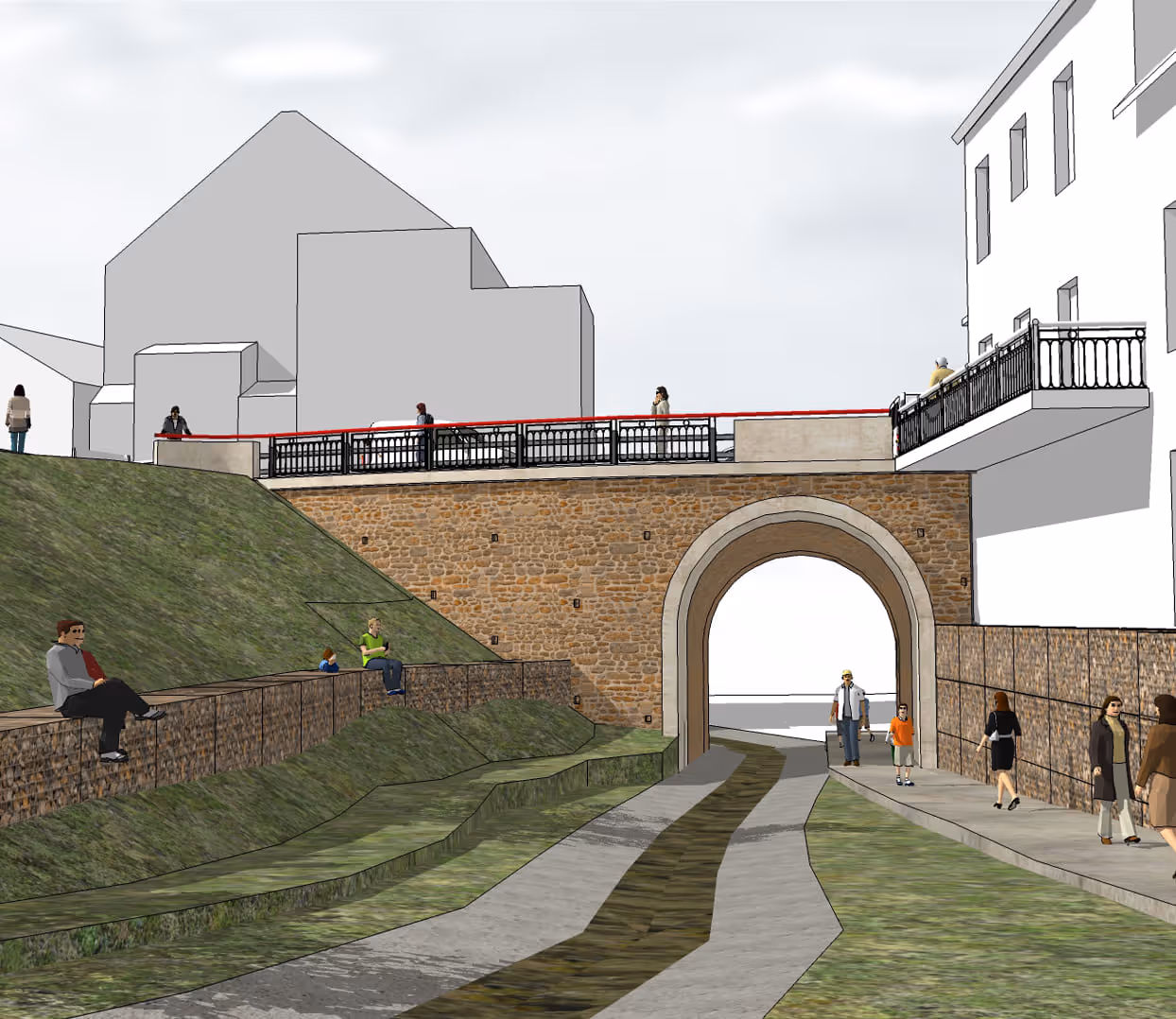 Une série de totems annoncera la traversée. En rive, un aménagement identique sera mis en œuvre.
